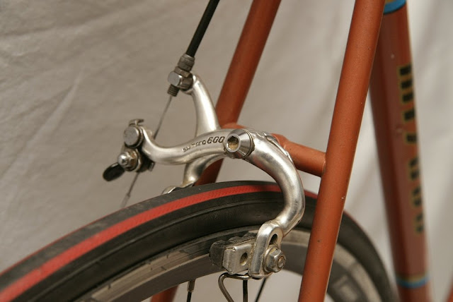 Komponenten sind mehrheitlich aus der sehr guten Shimano-600-Linie. Der Sattel ist ein Klassiker und den Rennsätteln, nämlich ein Selle San Marco Rolls. Er ist frisch gefettet und in sehr gutem Zustand.