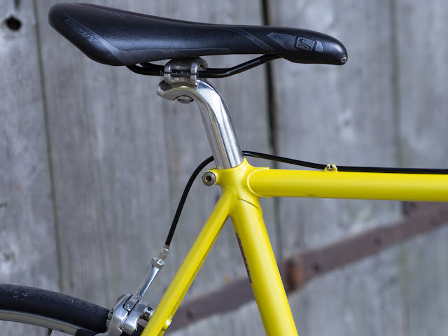 Schneller wie wendiger Cityracer mit Vintage-Rennrahmen in Metallic-Zitronengelb, frisch aufgebaut mit 12-Gang Shimano-Klickschaltung, radial gespeichtem Vorderrad von Gipiemme, Scott-Sattel, 3TTT-Lenkervorbau. Umwerfer und Wechsel Shimano 600. Grader, gekürzter "flatbar" Kompaktlenker. Lackierung mit ein paar kleinen Schrammen und Ausbesserungen. Alltagstaugliche Drahtreifen mit Pneu und Innenschlauch, keine heiklen Collés.